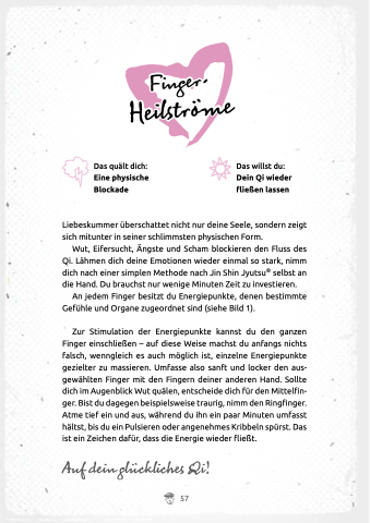 Zur Stimulation der Energiepunkte kannst du den ganzen Finger einschließen – auf diese Weise machst du anfangs nichts falsch, wenngleich es auch möglich ist, einzelne Energiepunkte gezielter zu massieren. Umfasse also sanft und locker den aus- gewählten Finger mit den Fingern deiner anderen Hand. Sollte dich im Augenblick Wut quälen, entscheide dich für den Mittelfin- ger. Bist du dagegen beispielsweise traurig, nimm den Ringfinger. Atme tief ein und aus, während du ihn ein paar Minuten umfasst hältst, bis du ein Pulsieren oder angenehmes Kribbeln spürst. Das ist ein Zeichen dafür, dass die Energie wieder fließt.